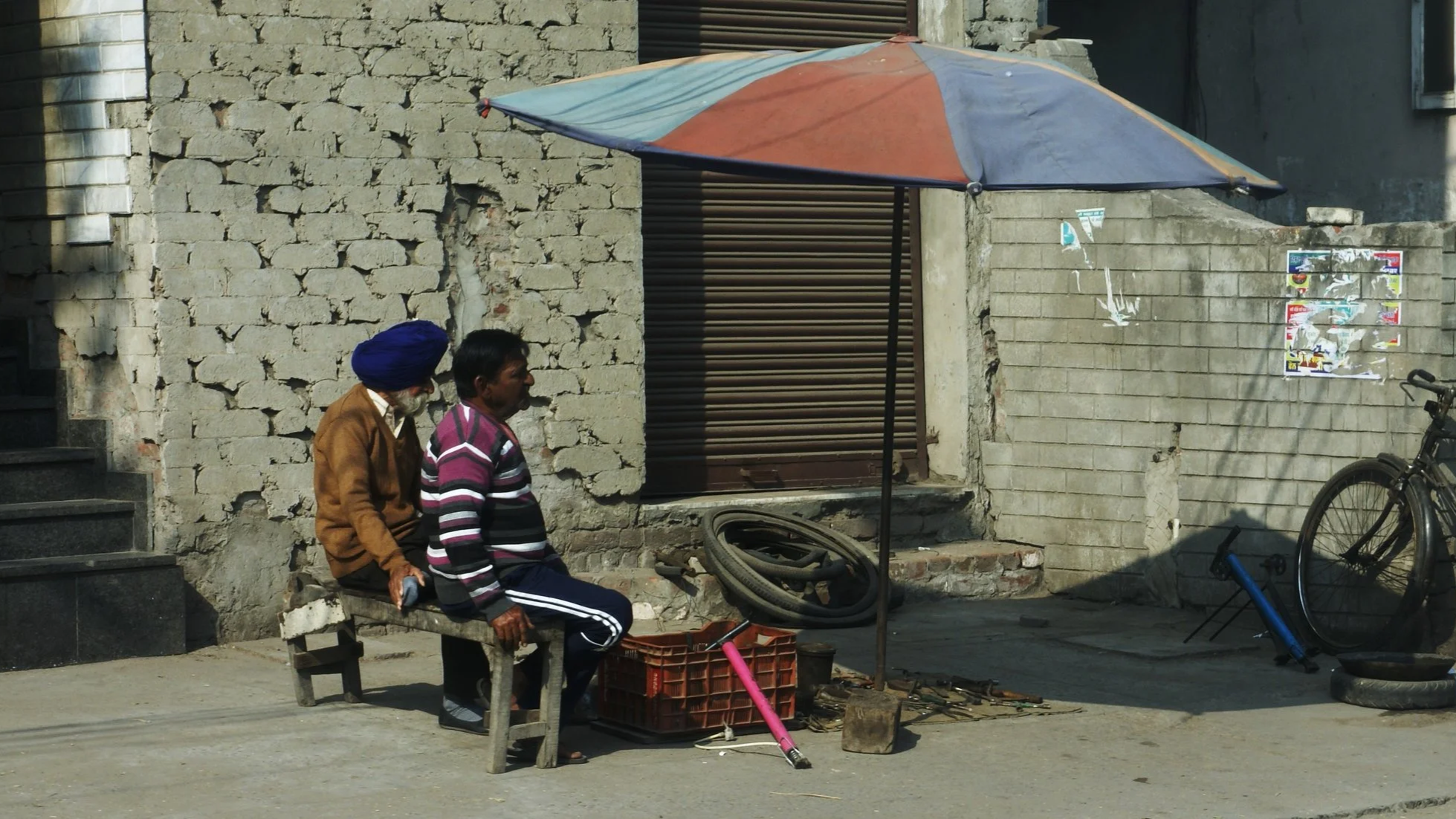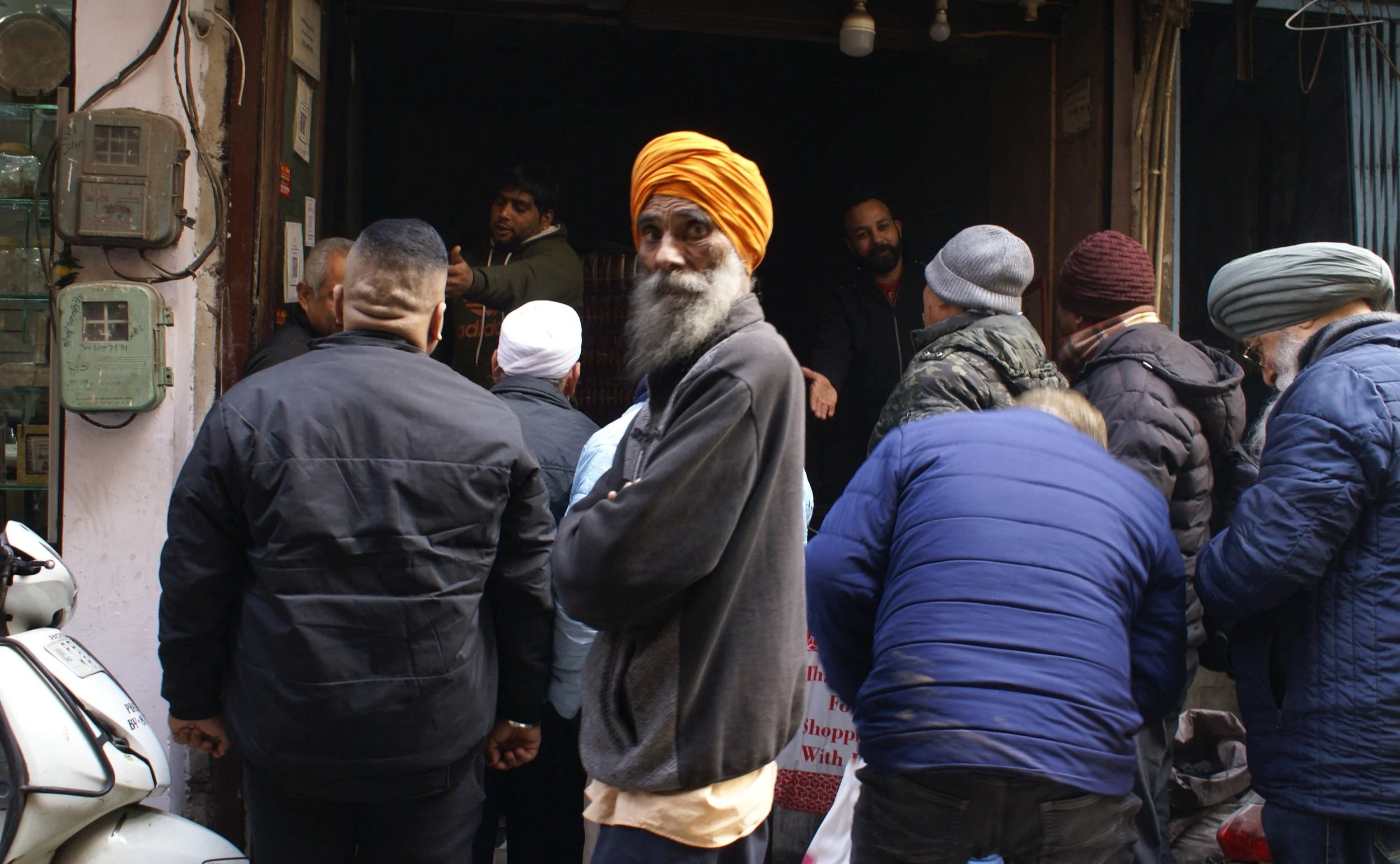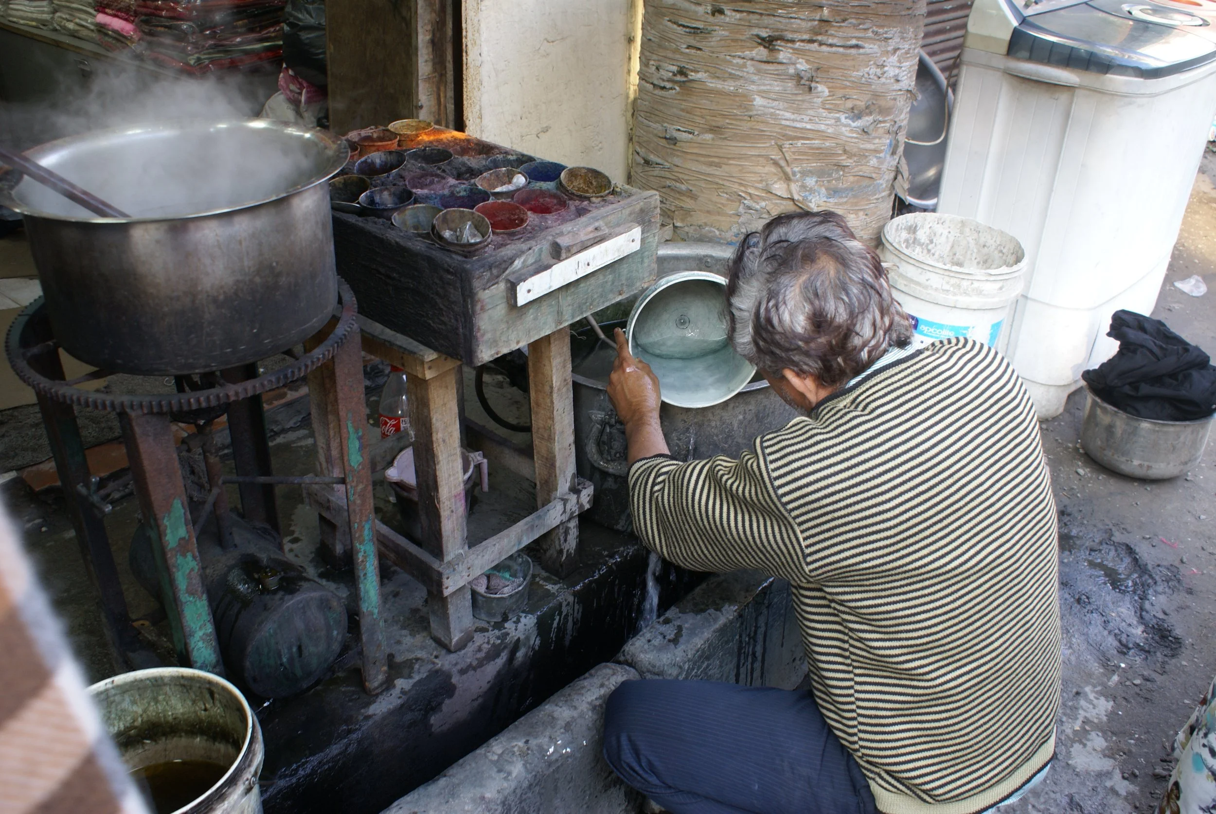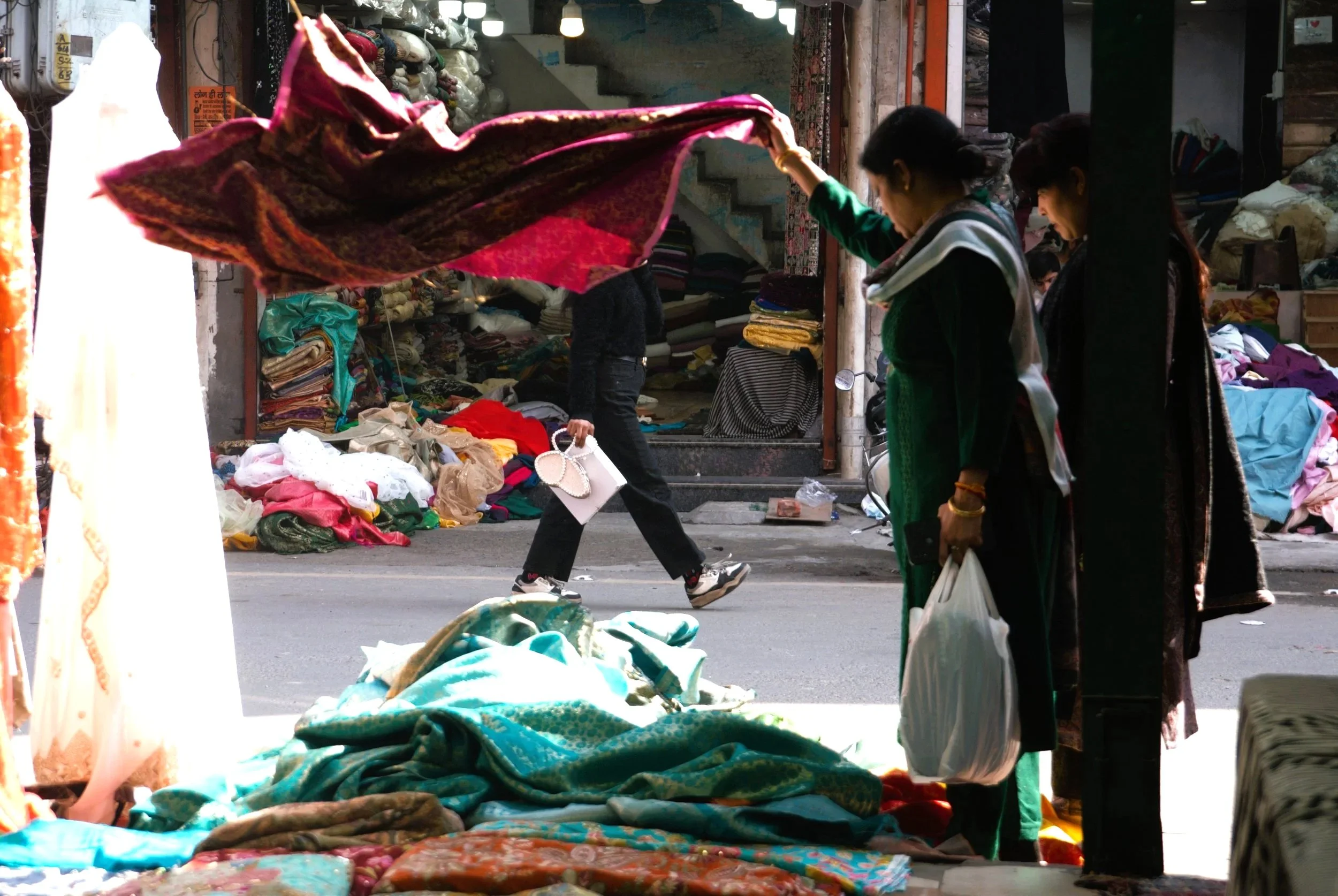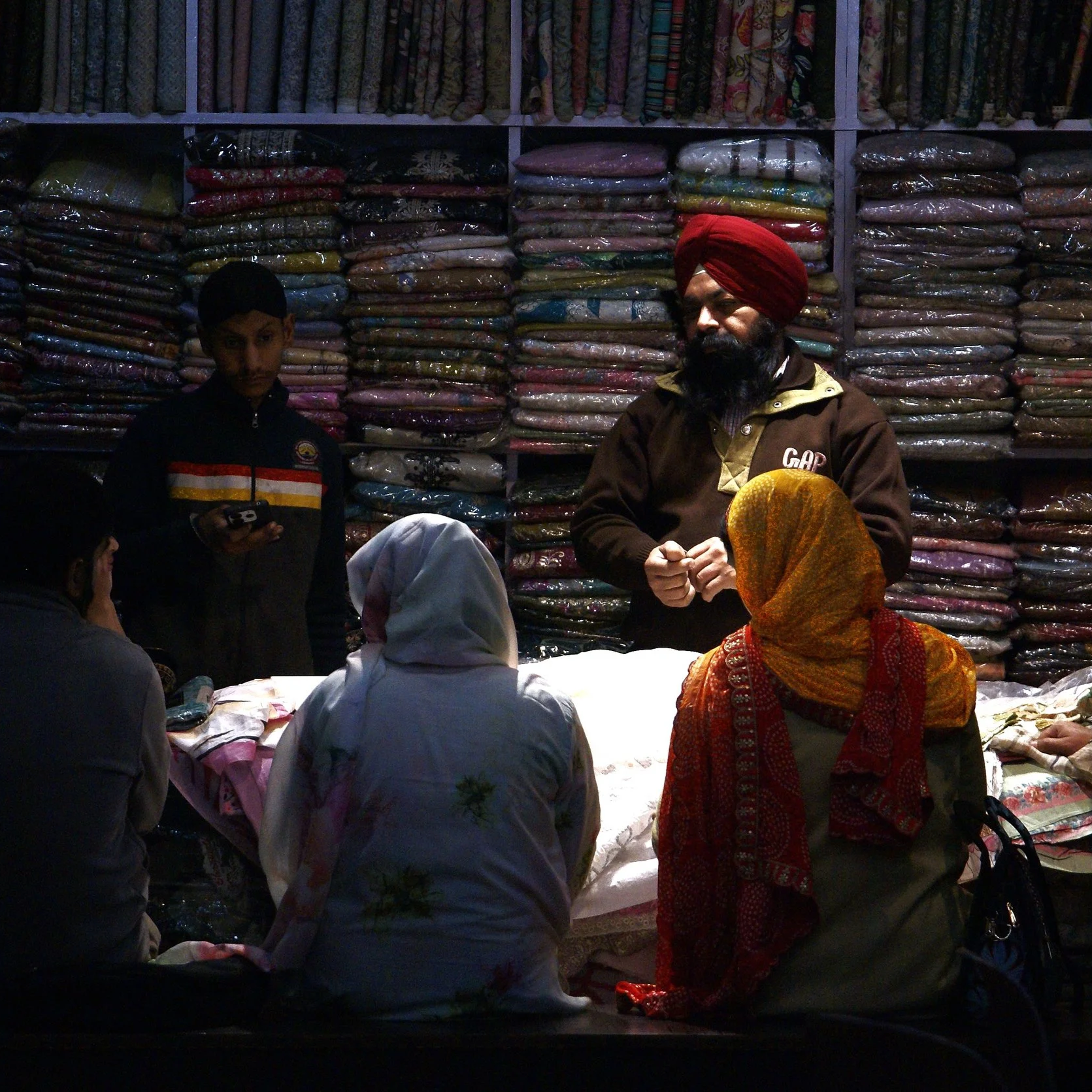 A woman assesses fabric by touch and light in Ludhiana, often described as the textile hub of India.